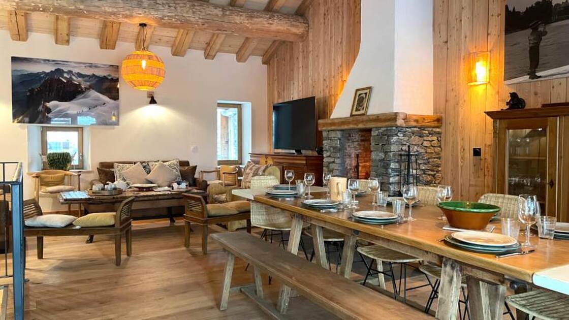 - une pièce de vie avec table pour 12 personnes, une cheminée, un salon, une cuisine ouverte équipée, une porte-fenêtre donnant sur l'extérieur ;